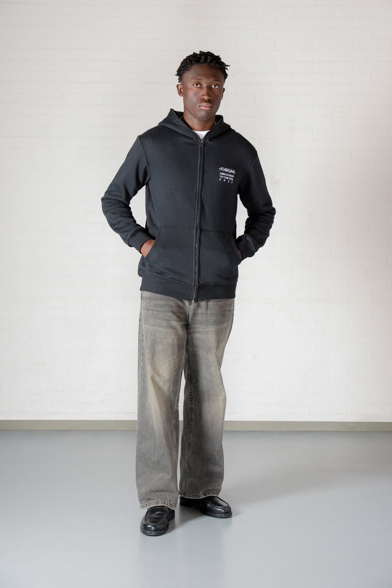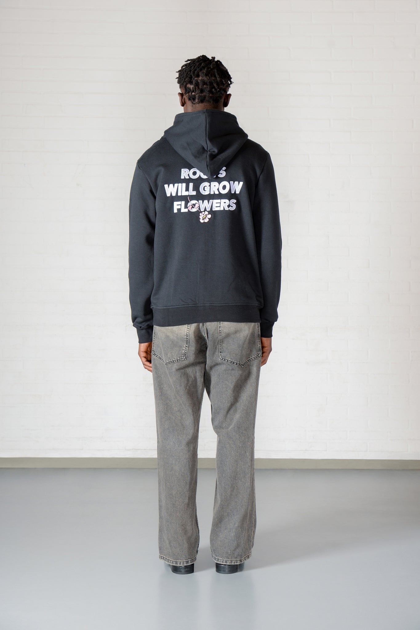 L'ORIGINE Iconic and two way shark zip hoody black is shaped for a comfortable fit and completed with an embroidery on the chest and the Roots Will Grow Flowers Script on the back.