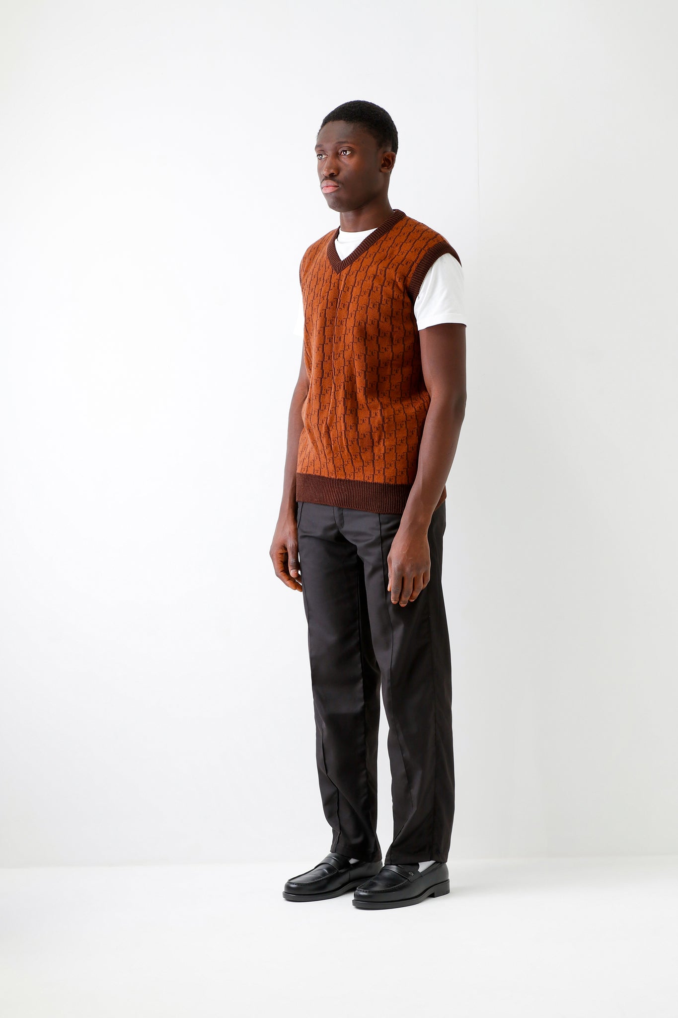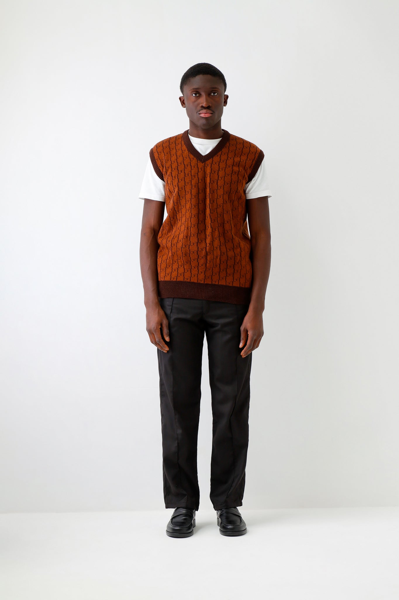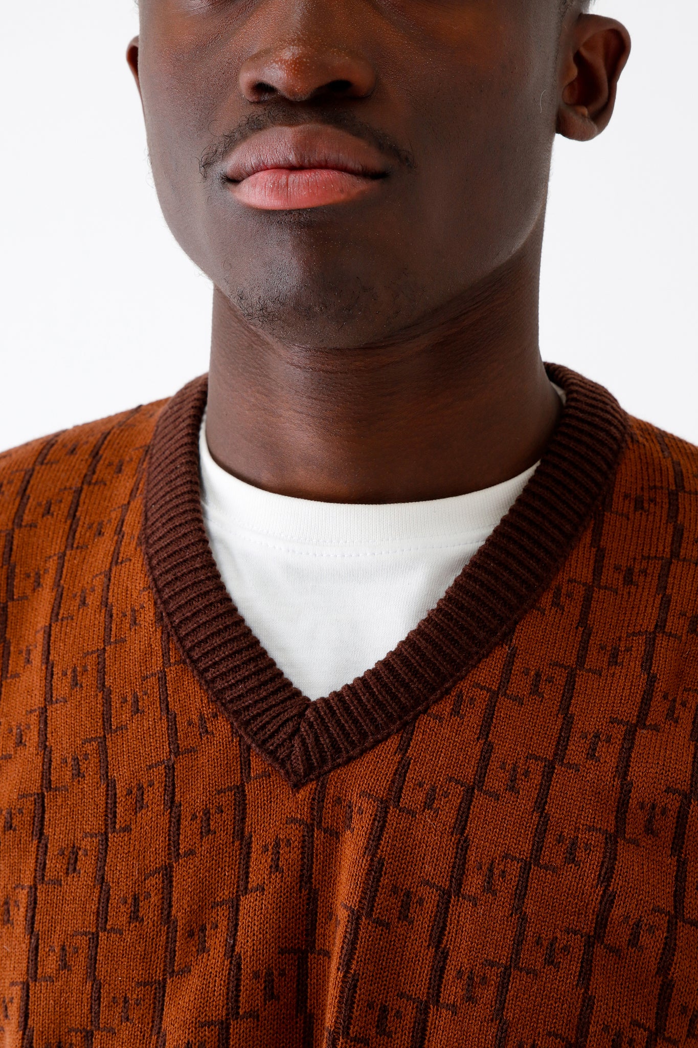 L'ORIGINE Iconic Chestnut Randy Sweater Vest is shaped to fit comfortable and warm. It features the V-neck and hem in a contrasting color and is completed with our jacquard L'upio diamond pattern.